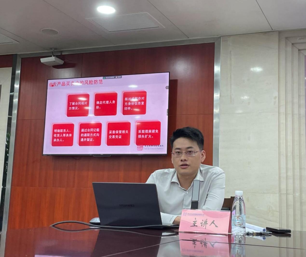 本次培训由集团法务审计部主办、农发实业集团承办,邀请天达共和律师事务所方健律师以“农产品贸易中的法律风险及防范措施”为主题开展专题讲座。讲座围绕农产品贸易中的交付、合同履行、运输、“背靠背”等四个方面的风险与防范,阐述了常见的风险点与应对措施,并通过以案释法,让参会人员对农产品贸易各环节的风险点有了更深入的理解和认识。